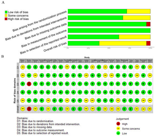 The quality of the studies included varied from low to high risk of bias. Among the 21 studies that were included in the analysis, 1 was assessed as having a “high risk” of bias overall, 12 were rated as having “some concerns,” and 8 were considered to have a “low risk” of bias. In terms of randomization, 14 studies were classified as low risk, while 4 raised some concerns. Regarding deviations from intended interventions, 5 studies raised some concerns and 13 were rated as low risk. For missing outcome data, 17 studies were found to be at low risk, while 1 was at high risk. For the risk of bias in the outcome measurement, all studies were classified as low risk. Regarding the selection of the reported results, 5 studies were found to raise some concerns and 13 were considered to be at low risk (Figure 8).