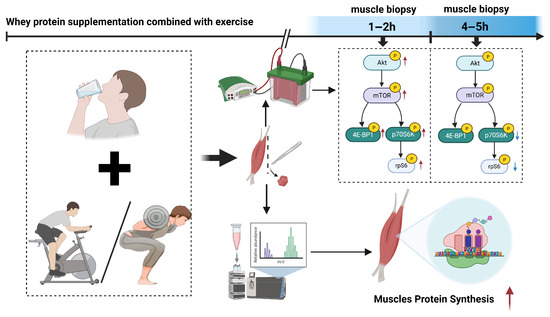 Muscle protein synthesis (MPS) is fundamental to muscle function and serves as the structural basis for improvements in exercise performance. Following a bout of exercise, the rate of MPS experiences an elevation for a brief period, known as the “anabolic window” [1]. Research has demonstrated that exercise activates the protein kinase B/Mechanistic Target of Rapamycin (AKT/mTOR) signaling pathway [2]. This activation has been shown to stimulate mTOR1, thereby enhancing MPS efficiency and improving both short-term athletic ability and long-term muscle adaptation [3,4]. Moreover, an increase in MPS has been shown to facilitate muscle repair and mitigate post-exercise soreness and fatigue, thereby enhancing muscle strength, endurance, and anaerobic power recovery [5].