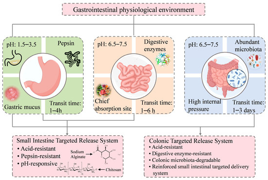 When preparing gastrointestinal targeted-release systems, selecting wall materials is extremely important. The characteristics of the gastrointestinal physiological environment are a major consideration. The gastrointestinal physiological environment and strategies for selecting wall materials are summarized in Figure 1.