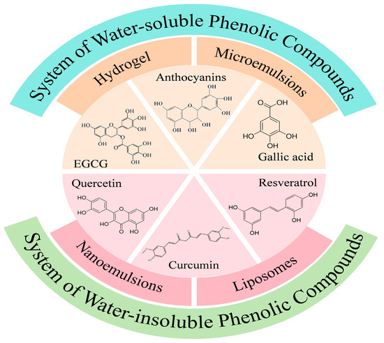 For water-soluble phenolic compounds such as gallic acid, anthocyanins, and epigallocatechin gallate (EGCG) [92,93], their favorable water solubility facilitates smooth transport through the gastrointestinal tract and rapid dispersion for absorption by the intestinal mucosa. However, these compounds remain susceptible to degradation from gastric acid and digestive enzymes. To overcome this challenge, researchers have developed targeted release systems based on hydrogels and microemulsions.