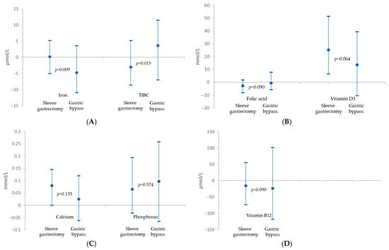 Comparison of 10-year changes in nutrient parameters between sleeve gastrectomy and gastric bypass subgroups. (A) Iron and TIBC (Total Iron Binding Capacity), (B) Folic and vitamin D3, (C) calcium and phosphorus, (D) vitamin B12. Markers represent median differences in nutritional parameter values between baseline and follow-up; whiskers indicate the upper and lower quartiles.