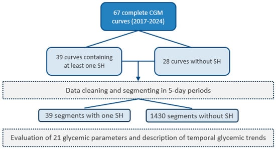 To ensure data quality prior to their use in the models, several pre-processing steps were carried out. Firstly, blood glucose measurements from different sources were combined to produce a single CGM curve per patient. Next, the curves were resampled at a uniform frequency of 15 min to standardize the analysis and facilitate comparisons. Short-duration data gaps were filled by linear interpolation and data-free periods longer than two hours were eliminated. Then, the remaining segments were divided into five-day fragments to standardize curve length. The segments containing an episode of SH were divided in the following way: first, the five days before the SH episode were removed from the rest of the segment, with the moment of the SH being the last point; then the rest of the segment was divided into periods of 5 days. For the segments containing no SH, the procedure was the same, except that the first step was ignored. After this processing, the curves were labeled and separated into two categories: those that ended in an SH event (37 curves) and those that did not (1430 curves) (Figure 1—flowchart).