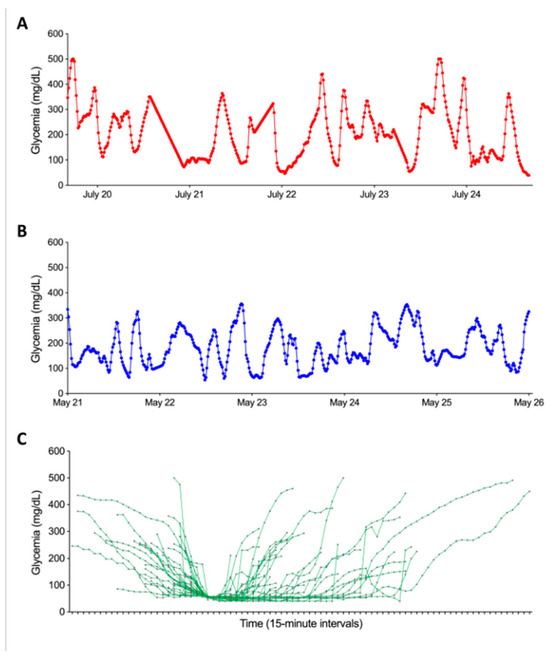 Graphical representation of the temporal evolution of glycemic curves in our dataset. Panel (A) illustrates the progression of glycemia during the five days ending with an SH event. Panel (B) presents the evolution of glycemia in the five days not ending with an SH event. Both panels share axes: x-axis = time (5-day window), y-axis = glucose (mg/dL). Panel (C) shows the graphical representation of the 39 SH based on CGM data synchronized to hypoglycemia onset (time 0). The X-axis represents the time relative to the onset of hypoglycemia, while the Y-axis shows glycemia in mg/dL. Each curve corresponds to a SH. The start of the curve marks the beginning of the glycemia drop, and the end corresponds to the first glycemic peak following the episode.