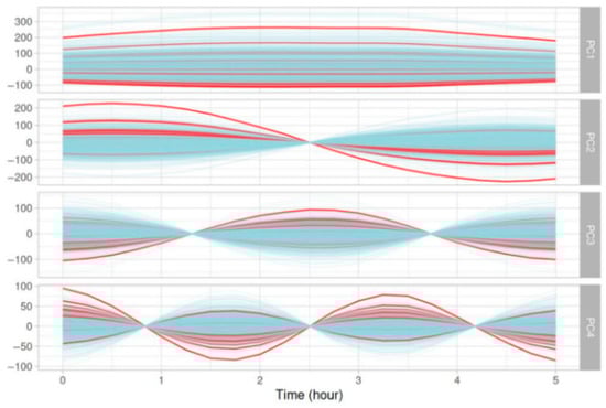 Graphical representation of the four principal components from a PCA analyzing the evolution of glycemic parameters over the last five hours of five-day glycemic segments. Red curves represent glycemic evolution ending with an SH event, while blue curves correspond to glycemic evolution not ending with an SH event.