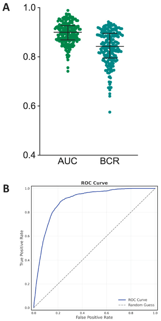 Panel (A) displays boxplots summarizing model performance across 200 resampling iterations, with AUC (median: 90%) and BCR (median: 84%) demonstrating consistent predictive accuracy. Panel (B) presents the ROC curve, where the x-axis showing false positive rate (1—specificity) and y-axis indicating true positive rate (sensitivity).