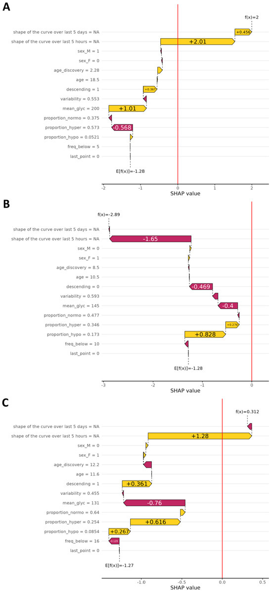 Waterfall plots illustrate the individual impact of each parameter on the final prediction of the SH model, based on SHAP values. In the upper part, Panel A, the plot shows contributions for true positive predictions (correctly identified SH). In the middle part, Panel B, the plot corresponds to true negatives (correct predictions of no SH). In the lower part, Panel C, it shows false positives (predicted SH event that did not occur). The X-axis represents the SHAP value, indicating how much each parameter contributes (positively or negatively) to the model’s decision for a given prediction. The Y-axis lists the glycemic parameters used in the model. A positive SHAP value drives the prediction toward SH, while a negative value shifts it away from that outcome.