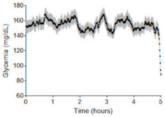 Temporal evolution of blood glucose levels for segments falsely identified as SH by the prediction model. The X-axis shows the five-day period of the analyzed segments, while the Y-axis represents blood glucose levels in mg/dL. This plot compiles all five-day segments that were falsely predicted to end in SH (false positives). Each point reflects the average blood glucose value at a given time across all such curves. The gray-shaded area around each point indicates the 95% confidence interval, representing the variability of glucose levels at that specific time.