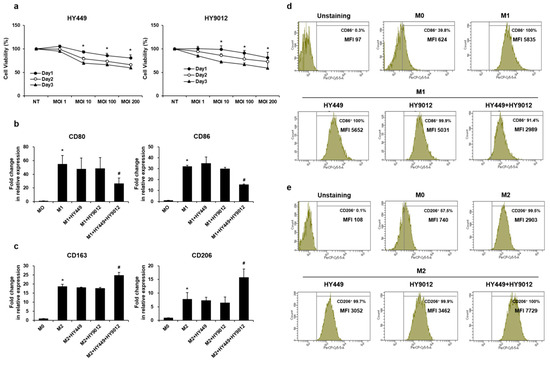 Effect of HK-HY449 and HK-HY9012 on the polarization of M1 and M2 macrophages. (a) THP-1 cells were differentiated into M0 macrophages by treatment with 150 nM PMA for 24 h, followed by incubation with varying MOIs of HK-HY449 and HK-HY9012. Cell viability was determined by the MTT assay daily over a period of 3 days. (b,c) THP-1 cells were exposed to M1 differentiation medium (1 μg/mL P. gingivalis LPS and 20 ng/mL IFN-γ) or M2 differentiation medium (20 ng/mL each of IL-4 and IL-13), either alone or in combination with HK-HY449 and 6-HY9012, for 48 h. The mRNA levels of CD80, CD86, CD163, and CD206 were analyzed using RT-qPCR. Expression of the control was set to 1, and values were normalized to β-actin mRNA. (d,e) Cell surface expression of CD86 and CD206 was measured by flow cytometry, quantifying both the percentage of positive cells and mean fluorescence intensity (MFI). All quantitative data are presented as mean ± standard deviation; * p < 0.05 vs. M0, # p < 0.05 vs. M1.