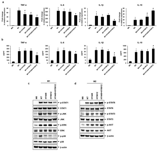 Effect of HK-HY449 and HK-HY9012 on inflammatory cytokine secretion and polarization-associated signaling pathways in M1 and M2 macrophages. THP-1 cells were exposed to M1 or M2 differentiation medium alone or in combination with HK-HY449 and HK-HY9012 for 48 h. (a) The mRNA levels of TNF-α, IL-6, IL-1β, and IL-10 were analyzed by RT-qPCR. Expression of the control was set to 1, and values were normalized to β-actin mRNA. (b) TNF-α, IL-6, IL-1β, and IL-10 concentrations in cell culture medium were determined by ELISA. All quantitative data are presented as mean ± standard deviation; * p < 0.05 vs. M0, # p < 0.05 vs. M1. THP-1 cells were polarized toward the M1 or M2 phenotype for 24 h, during which HK-HY449, HK-HY9012, or their combination was administered for the final hour of the differentiation process. (c,d) Western blots probed with anti-STAT1, anti-phospho-STAT1, anti-JNK, anti-phospho-JNK, anti-ERK, anti-phospho-ERK, anti-p38, anti-phospho-p38, anti-STAT6, anti-phospho-STAT6, anti-STAT3, anti-phospho-STAT3, anti-AKT, and anti-phospho-AKT antibodies. Anti-β-actin was used as a loading control.