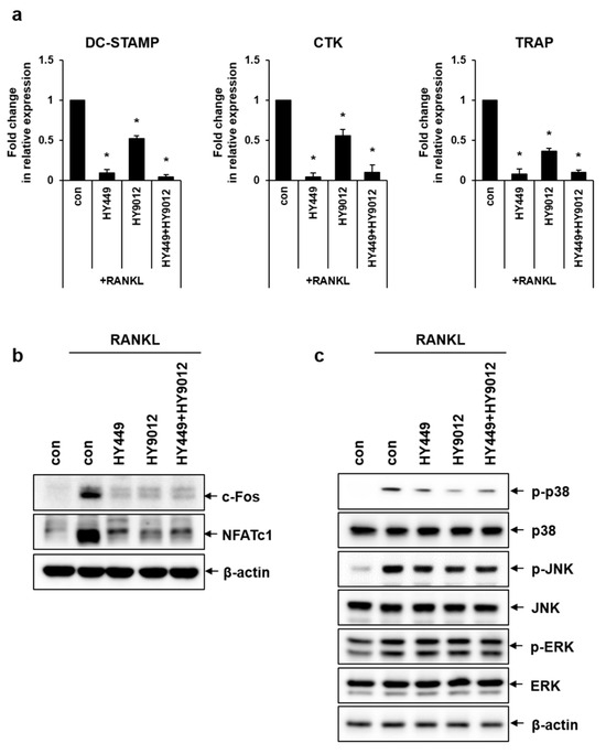 Effect of HK-HY449 and HK-HY9012 on expression of osteoclast-related genes and signaling pathways. BMMs were incubated in osteoclastogenic medium with HK-HY449 and HK-HY9012 for 5 days. (a) The mRNA levels of DC-STAMP, CTK, and TRAP were evaluated by real-time PCR. Expression of the control was set to 1, and values were normalized to β-actin mRNA. (b) Protein levels of c-Fos and NFATc1 were evaluated by Western blotting. (c) BMMs were treated with HK-HY449 and HK-HY9012 in osteoclastogenic medium for 10 min. The cell lysate was analyzed by Western blotting to detect phosphorylated p38, ERK, and JNK. Anti-β-actin was used as loading control. All quantitative data are presented as mean ± standard deviation; * p < 0.05 vs. control groups.