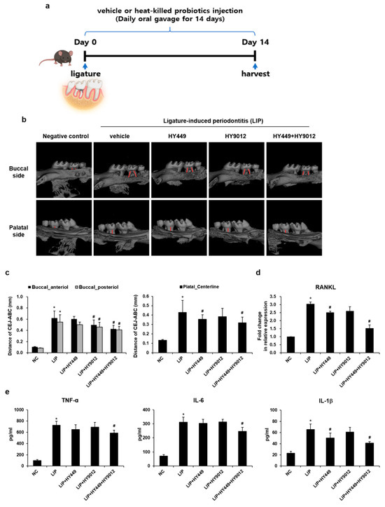 Effect of HK-HY449 and HK-HY9012 on ligature-induced periodontitis in an in vivo mouse model. Ligatures were placed around the left maxillary second molars, and mice received daily oral gavage of HK-HY449, HK-HY9012, or their combination for 14 days. Maxillae were collected on day 14. (a) Schematic timeline of ligature-induced periodontitis and probiotic administration. (b) Representative micro-computed tomography images showing vertical bone loss around the maxillary second molars after 14 days of ligation. (c) Alveolar bone loss was quantified by measuring the distance between the cementoenamel junction and the alveolar bone crest (CEJ–ABC) at the anterior and posterior buccal regions and the palatal centerline of the second molar using 3D reconstructions. (d) Relative mRNA expression levels of RANKL in gingival tissue, analyzed by RT-qPCR and normalized to β-actin. (e) Serum concentrations of TNF-α, IL-6, and IL-1β were measured by ELISA. All quantitative data are presented as mean ± standard deviation; * p < 0.05 vs. control, # p < 0.05 vs. ligature-induced periodontitis.