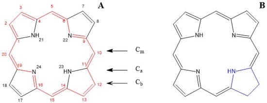 Porphyrin (A) with the IUPAC atom numbering and carbon types, and the chlorin ring (2,3-dihydroporphyrin, (B)) with the hydrogenated site in blue.