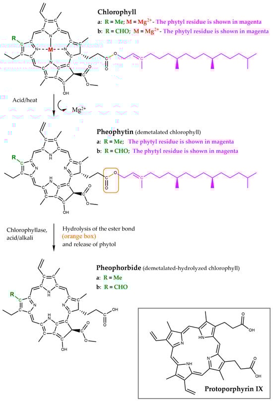 Pheophytin is a dark bluish pigment obtained by treating chlorophyll with a weak acid, or after thermal treatment [28]; the molecule lacks the central magnesium ion (Figure 3). As with chlorophyll, two main types of pheophytin exist: pheophytin a and pheophytin b, corresponding to chlorophyll a and b, respectively.