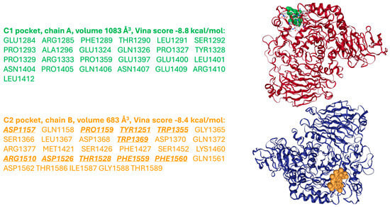 Molecular docking obtained with CB-Dock2 web-based software showing the most relevant interactions of pheophorbide a (shown as green and orange space filling molecules) with the human maltase-glucoamylase enzyme (PDB ID: 3TOP). In the C2 pocket, the residues of the active site, identified also for acarbose interactions [47], are in bold and underlined. Protein structures of chains A and B are shown as ribbon diagrams in red and blue, respectively.