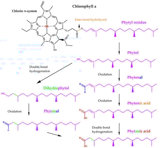 Phytanic acid from chlorophyll. Drawn based on chemical structures presented in reference [56]. Colour coding is used for visual distinction between different functional groups and molecular modifications.