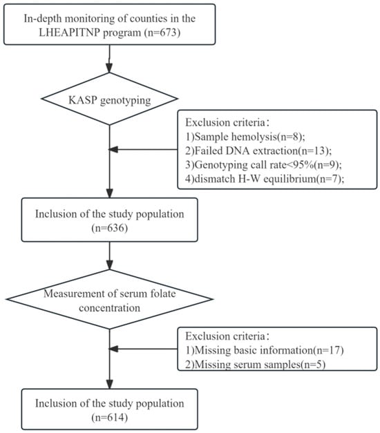 All statistical analyses were conducted by SAS (v. 9.4) statistical software, and data visualization was performed using R 4.5.1. Based on the non-normal distribution of continuous variables (age, BMI, birth weight/height), they are presented as median and quartiles, the differences of which were assessed using the Kruskal–Wallis test. Categorical variables (gender, province, caregiver’s education level) are presented as the number of instances (n) and percentages (%), and their prevalences were compared using the χ2 test. Low folate levels are defined as serum folate levels < 6 ng/mL, and high folate levels are defined as >20 ng/mL [25]. Groups based on serum folate level thresholds enable comparison of baseline characteristics across different folate status categories. Serum folate levels and cognitive scores show a skewed distribution, so further analysis was conducted after logarithmic transformation. Hardy–Weinberg equilibrium analysis of different genes was also performed through the χ2 test.