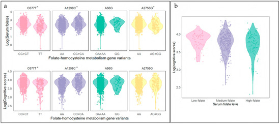 Association analysis between gene variants, serum folate levels, and cognitive scores. (a) single gene and folate/cognition; (b) folate and cognition. * p < 0.05.