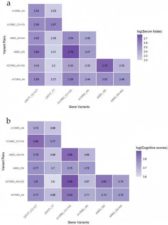 Logarithmic serum folate levels/cognitive scores by combined genotypes. (a) combined genotypes and folate; (b) combined genotypes and cognition.