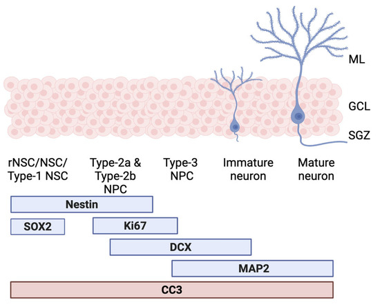 Markers of the neurogenic process. Diagram showing how the selected neurogenesis markers target different aspects of the neurogenic process: starting from neural stem cells (left) through to mature neurons (right). Bars represent the markers expressed by each cell type. These include markers of stem cell integrity (SOX2 and Nestin), a marker of proliferation (Ki67), a marked of neurobalsts (DCX), and a marker of immature neurons (Map2). CC3, a marker of apoptosis can be expressed by any of these cell types. It is an integral part of neurogenesis regulation. rNSCs/NSCs: radial glial-like or neural stem cells; NPCs: neural progenitor cells. ML: molecular layer, GCL: granular cell layer, SGZ: subgranular zone, SOX2: SRY (sex determining region Y)-box 2, Ki67: Antigen Kiel 67, DCX: doublecortin, MAP2: microtubule associated protein 2, and CC3: cleaved caspase 3. Figure adapted from [23] in BioRender.