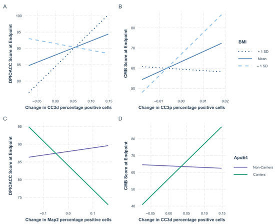 Moderation effect of BMI and ApoE4. Graphical representation of the interaction results reported in Table 5. Top row shows the impact of BMI on (A) the association between the change in CC3d and original Cue accuracy performance at the endpoint (DPIOACC) and (B) the change in CC3p and original and novel cure accuracy combined scores at the endpoint (CMB). BMI was treated as a continuous variable in this analysis; for ease of representation and to understand the impact of varying BMIs, we show the average association between the marker and the outcome for mean BMI (BMI = 28.4, dashed line), mean BMI +1SD (BMI = 32.7, solid line), and mean BMI -1SD (BMI = 24.2, dotted line). Bottom row shows the impact of ApoE4 carrier status. (C) shows how the association between the change in Map2 and performance on the original cue accuracy task (DPIOACC) is moderated by carrier status, while (D) shows how the association between the change in CC3d and the original and novel combined scores (CMB) is moderated. For this analysis, ApoE4 was treated as a categorical variable; associations for carriers for one or two ApoE4 alleles are shown in green, while those for non-carriers are shown in purple. CC3p stands for the percentage of hippocampal progenitor cells positive for the CC3 marker following the proliferation assay. CC3d stands for the percentage of hippocampal progenitor cells positive for the CC3 marker following the differentiation assay. The Map2 readout is the percentage of hippocampal progenitor cells positive for the Map2 marker following the differentiation assay. Each participant’s change in each marker is calculated by subtracting the percentage of positive cells for the respective marker following treatment with serum samples collected at the endpoint minus the percentage of positive cells for that marker following treatment with serum samples collected at baseline visits.