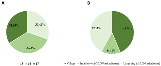 The study group consisted of 999 minors. 582 women (58.26%) and 417 men (41.74%) participated in the study. The participants were students aged 15–17 from high schools in the Podkarpackie region. The place of residence varied, but the majority of the respondents—562 (56.26%)—came from the city and 437 (43.74%) from the countryside (Figure 1).