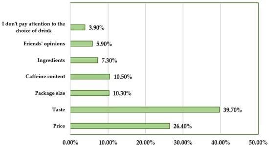 The reasons for choosing a specific type of product and the frequency of their declarations by respondents in the survey are presented in Figure 2. The most common reason was taste (n = 397, 39.7%), while the least common was the opinion of friends (n = 59, 5.9%). It should be noted that only 39 (3.9%) respondents do not pay attention to the type of energy drink they choose.