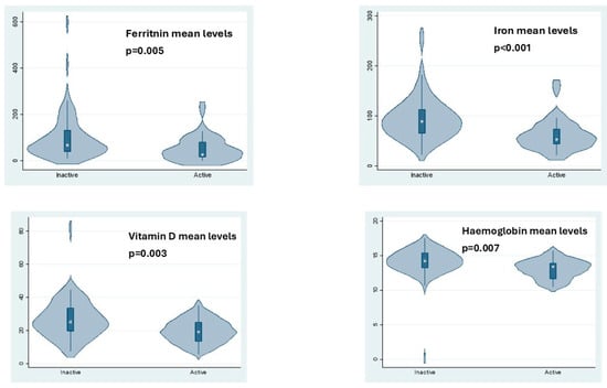 Figure 1 showed the box plot of the mean serum level of Hb, iron, ferritin and vitamin D among the active and inactive groups. Mean serum levels among the active and inactive groups are reported as Supplementary Table S2.