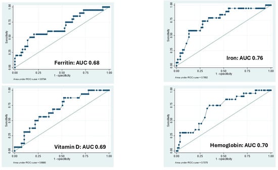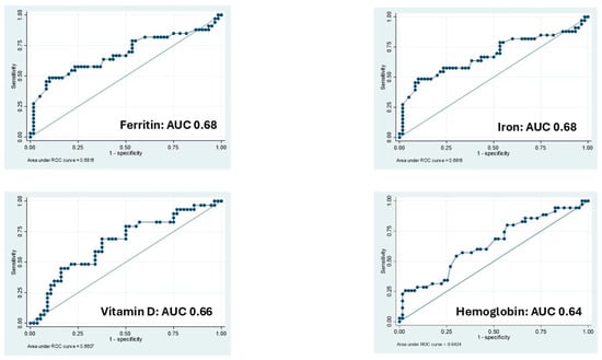 Hb levels showed a suboptimal correlation with clinical disease activity in IBD patients (OR 0.80; 95% CI 0.62–1.03). The ROC analysis yielded an Area Under the Curve (AUC) of 0.70 (p = 0.06), suggesting limited discriminatory power. Iron and vitamin D levels demonstrated the highest accuracy in the ROC analysis, with AUCs of 0.76 (p < 0.001) and 0.68 (p = 0.013), respectively.