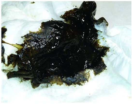 Meconium, the first stool passed by a newborn, typically within the first 24 to 48 h after birth, is composed of bile, mucus, intestinal epithelial cells, water, and materials ingested in utero, such as lanugo and amniotic fluid. It is characteristically viscous, sticky, and tar-like in texture, with a dark olive-green color and minimal odor [] (Figure 1). Its non-invasive and easy collection, along with the provision of a sufficient sample volume for analysis and the ability to reflect long-term intrauterine exposure, makes it an ideal biomarker of fetal exposure [].