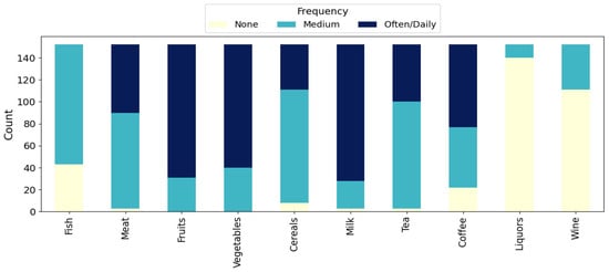 The stacked bar chart in Figure 2 shows the weekly consumption frequencies for various food and beverage categories among the mothers. Among the 152 mothers, frequent (often/daily) intake was most prevalent for milk (n = 124, 81.6%), fruits (n = 121, 79.6%), and vegetables (n = 112, 73.7%), with no mother reporting no consumption in these categories. Cereals, meat, and fish were mainly consumed at moderate frequencies, with 111 mothers (73.0%) reporting moderate cereal intake, 87 (57.2%) reporting moderate meat intake, and 109 (71.7%) moderate fish intake. Tea was also consumed in moderate frequencies (n = 97, 63.8%). For coffee, moderate (55, 36.2%) and frequent (75, 49.3%) consumption were both common. In contrast, hard alcoholic beverages (liquors) and wine were rarely consumed, as 140 mothers (92.1%) reported no consumption of liquors and 111 (73.0%) reported no wine consumption during the week.