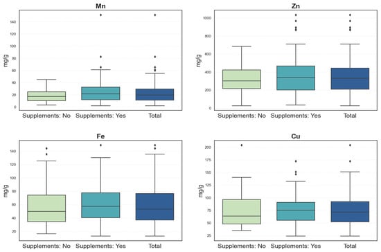 Among participants who did not use dietary supplements, the medians (IQRs) were 17.18 mg/g (16.01) for Mn, 301.71 mg/g (212.33) for Zn, 49.98 mg/g (40.44) for Fe, and 63.65 mg/g (48.54) for Cu. Supplement users showed slightly higher concentrations, with median (IQR) values of 21.35 mg/g (21.14) for Mn, 339.03 mg/g (285.70) for Zn, 57.40 mg/g (38.85) for Fe, and 75.35 mg/g (37.63) for Cu.