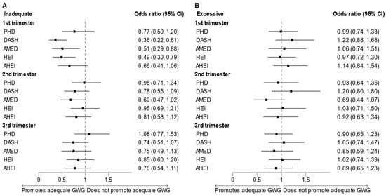 Forest plot of the associations between diet indices and trimester-specific (A) inadequate or (B) excessive gestational weight gain (adjusted for maternal age, race/ethnicity, education, parity, and total physical activity). Abbreviations: GWG: gestational weight gain.