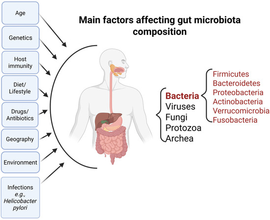 The human microbiome is described as the genetic content of microorganisms (microbiota) that live at a specific location within the body of each individual [41]. It contains bacteria, viruses, protozoans, fungi, and archaea with more than 1013 microbial cells [42]. Numerous projects such as the Human Microbiome Project (HMP) [43] and MetaHIT [44] focused their attention and resources on characterizing a healthy human microbiome composition, with the aim of achieving a better understanding of the microbial population living within our organisms and their influence on our state of health and disease. With a dynamic content, the diversity and richness of the microbiome is shaped by numerous factors, including age, sex, delivery type, feeding practices, lifestyle, pathogens, different external environmental factors as well as internal setting parameters (pH, humidity)—as illustrated in Figure 1 [45,46,47]. The GI tract hosts the highest number of microbes, due to its nutrient bioavailability. Represented by six major phyla such as Firmicutes, Bacteroidetes, Proteobacteria, Actinobacteria, Verrucomicrobia, and Fusobacteria, its composition varies with each anatomical component of the GI tract, sharing a common core [48,49].