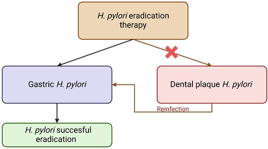 Finally, we must clarify that H. pylori’s presence not only has the capacity to alter the oral microbiome composition but also cause its eradication as well. Although this result upon gastric infection might be successful, antibiotics are not able to overpass the structure of the dental bacterial biofilm [101]. This facilitates H. pylori survival in periodontal environments, despite receiving adequate treatment. When analyzing dental pulp samples before initiating eradication therapy and 2 weeks after, Nomura and colleagues reported that nearly all H. pylori-positive samples taken from the same teeth remained positive, despite receiving adequate treatment [77]. In other words, there is a higher risk of reinfection with H. pylori despite its successful eradication from the gastric milieu, in patients carrying the bacteria in their dental plaques [76].