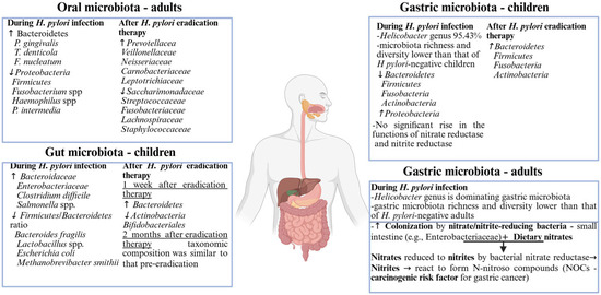 Nevertheless, we share the belief that the relation of H. pylori–human microbiota has a major influence on one’s state of health and disease. Characterizing the microbial compositional shifts determined by H. pylori’s presence or its eradication therapy represents only a small step towards the goal of a personalized medicine that will offer efficient management of this worldwide health problem. This narrative review provides insightful information on the current understanding of H. pylori infection through a critical synthesis of recent research findings.