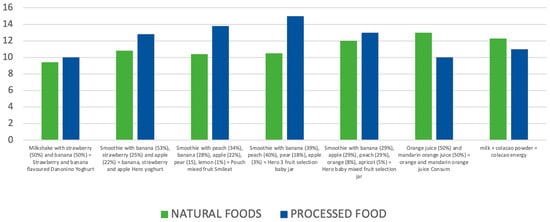 Breakfast plays a pivotal role in shaping children’s nutritional patterns, metabolic regulation, and oral health outcomes. In Mediterranean countries such as Spain, Italy, and Greece, breakfast is traditionally consumed at home; however, the increasing market penetration of industrially processed foods has altered this pattern, often leading to higher free sugar intake in children [,]. Our findings of significantly higher °Brix values in processed breakfast products compared to homemade and fresh fruit preparations are consistent with recent surveys conducted in Italy [], Greece [], and Portugal [], which report mean °Brix values between 13–15 in commercially packaged children’s foods. Similar patterns have been observed globally, including in the UK [], Australia [], and Brazil [], suggesting that elevated sugar content in packaged foods for children is a widespread phenomenon.