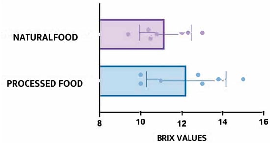 Average °Brix values in processed, homemade, and fresh breakfast foods. Processed products show significantly higher sugar concentrations (p < 0.01). Error bars indicate standard deviations.