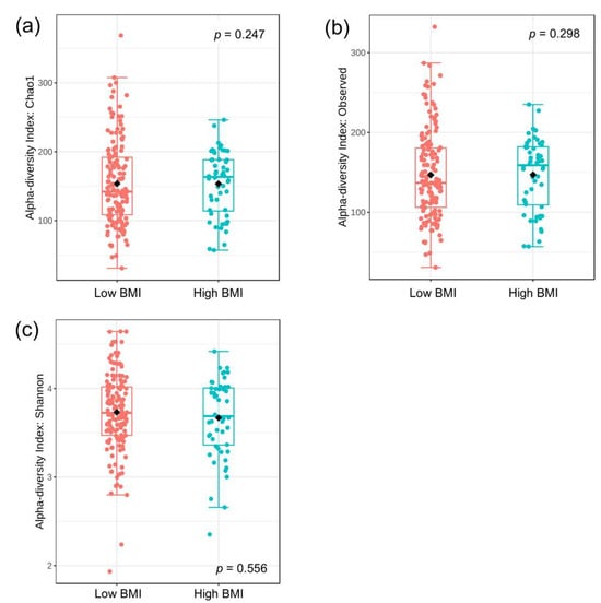 Alpha diversities between the low and high BMI groups: (a) Chao1 index, (b) observed index, and (c) Shannon index. Statistical measures were median, interquartile range, and outliers. The statistical analysis was performed using the Mann–Whitney test.