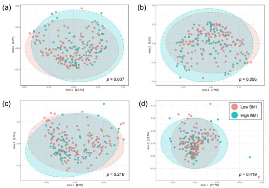 The principal coordinate analysis (PCoA) of beta-diversity profiling between the low and high BMI groups: (a) Bray–Curtis index, (b) Jaccard index, (c) Unweighted Unifrac index, (d) Weighted Unifrac index. The differences in beta diversity were tested PERMANOVA.