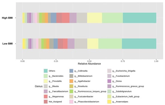 To determine whether the difference in gut microbial composition was associated with obesity, we compared the top 20 relative abundances of bacteria at the genus level according to patients’ BMI category (Figure 3 and Table S1).
