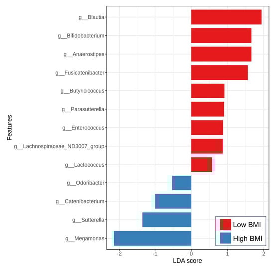 Linear discriminant analysis (LDA) effect size (LEfSe) analysis of gut microbiota between the low and high BMI groups at the genus level (LAD > 2, p < 0.05).