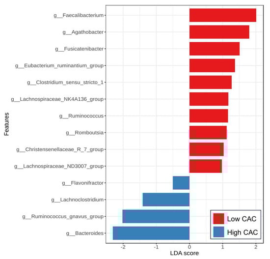 Linear discriminant analysis (LDA) effect size (LEfSe) analysis of gut microbiota between the low and high CAC score groups at the genus level (LAD > 2, p < 0.05).
