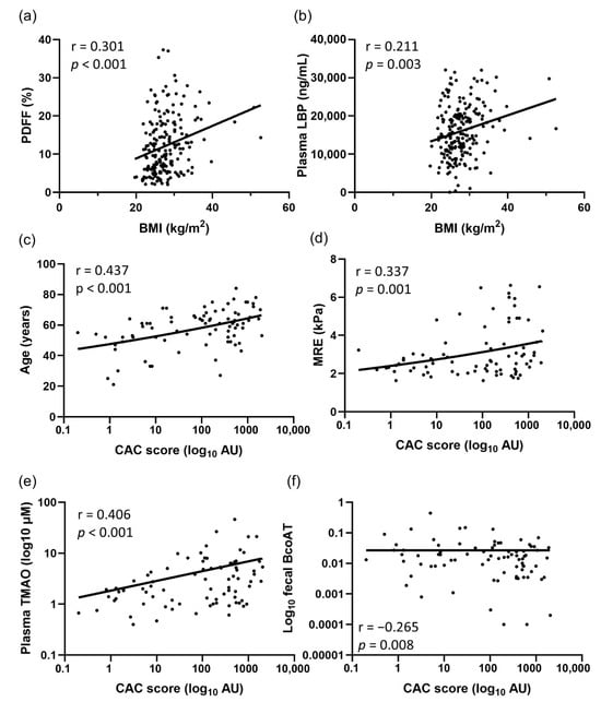 The correlations of selected parameters regarding BMI and CAC scores: (a) BMI vs. PDFF, (b) BMI vs. LBP, (c) CAC score vs. age, (d) CAC score vs. MRE, (e) CAC score vs. TMAO, and (f) CAC score vs. BCoAT. The statistical analysis was performed using Spearman’s rank test.