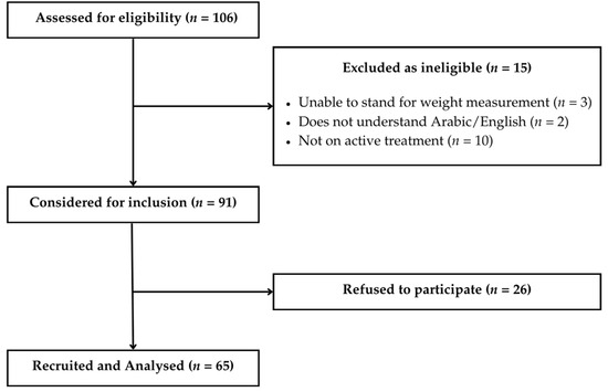 Of the 106 CRC patients initially screened, 91 met the eligibility criteria. After obtaining informed consent, 65 patients were enrolled and completed all assessments. The final sample size (n = 65) aligns with similar observational studies in oncology nutrition that utilized cross-sectional designs to assess the prevalence of malnutrition and its associations with symptoms [15,21]. However, no formal a priori power calculation was performed, and the modest sample size may have limited the ability to detect significant differences in subgroup analyses or perform stratified analyses (e.g., by stage, gender, or treatment modality). This should be considered when interpreting the generalizability and strength of associations. The participant flow is depicted in Figure 1.