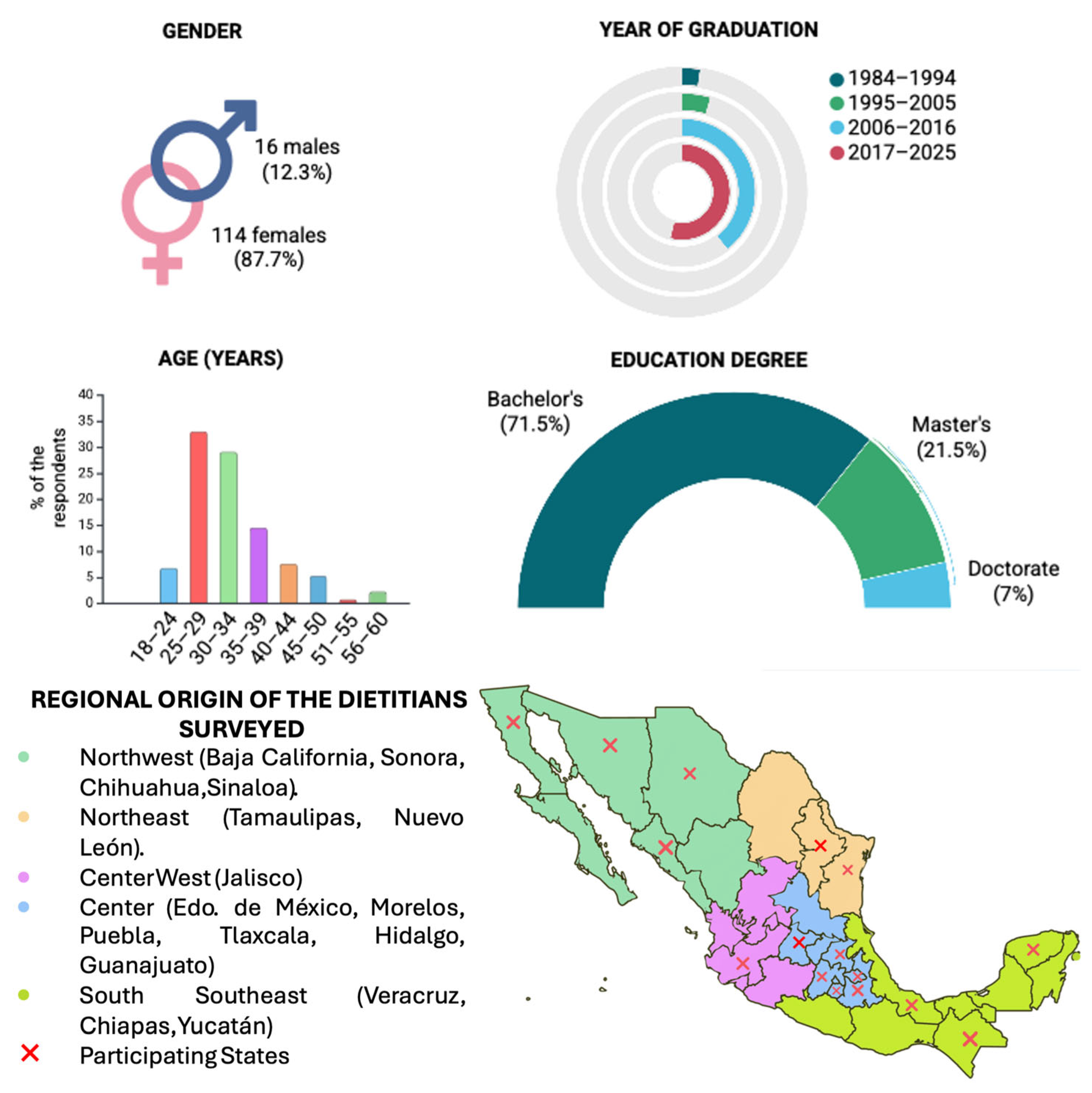 n = 130) highlights both the relevance of the topic and the level of engagement among Mexican dietitians. The survey was open access and remained available for nearly four months over two different years (2024 and 2025). This response rate reflects a meaningful degree of interest despite the voluntary nature of participation and the absence of incentives. Additionally, the sample includes professionals from various regions of the country, offering a reasonably representative perspective on the national context.