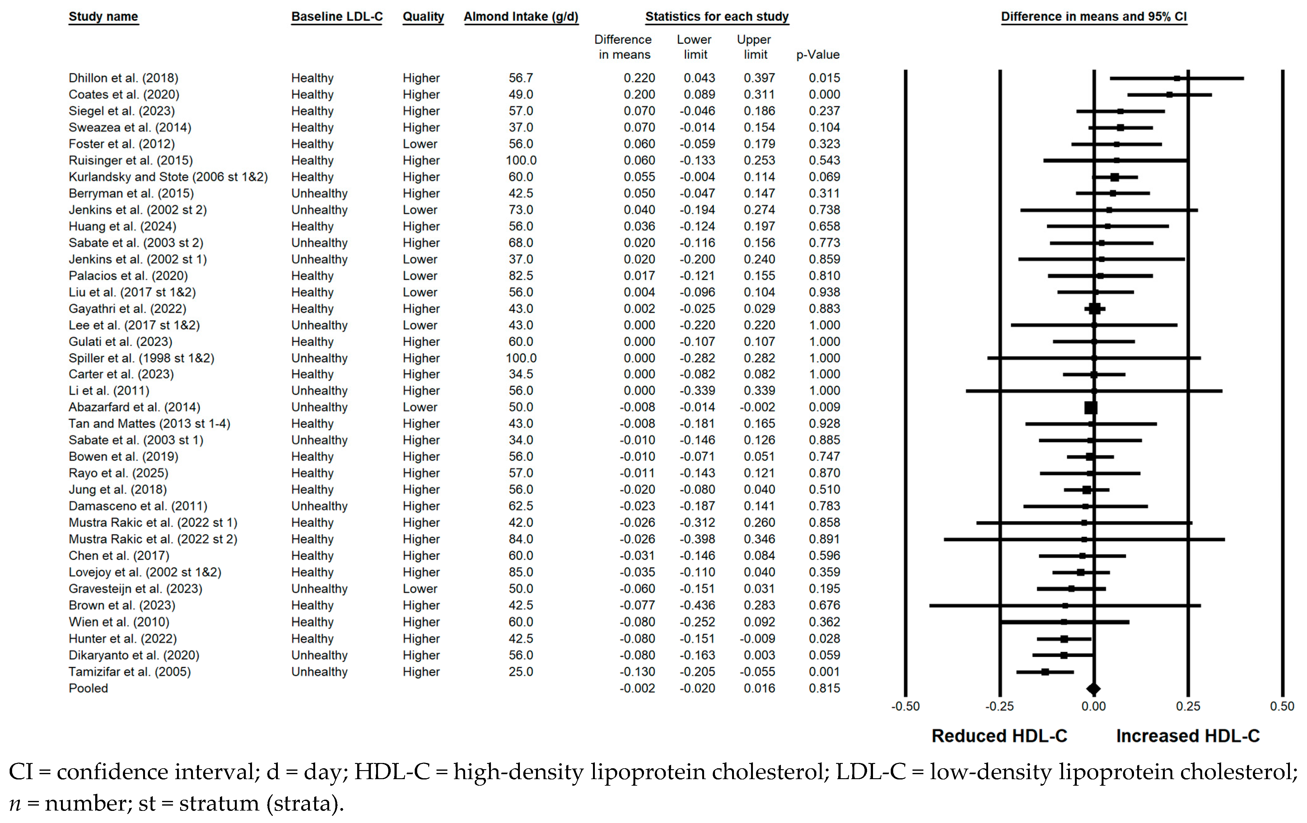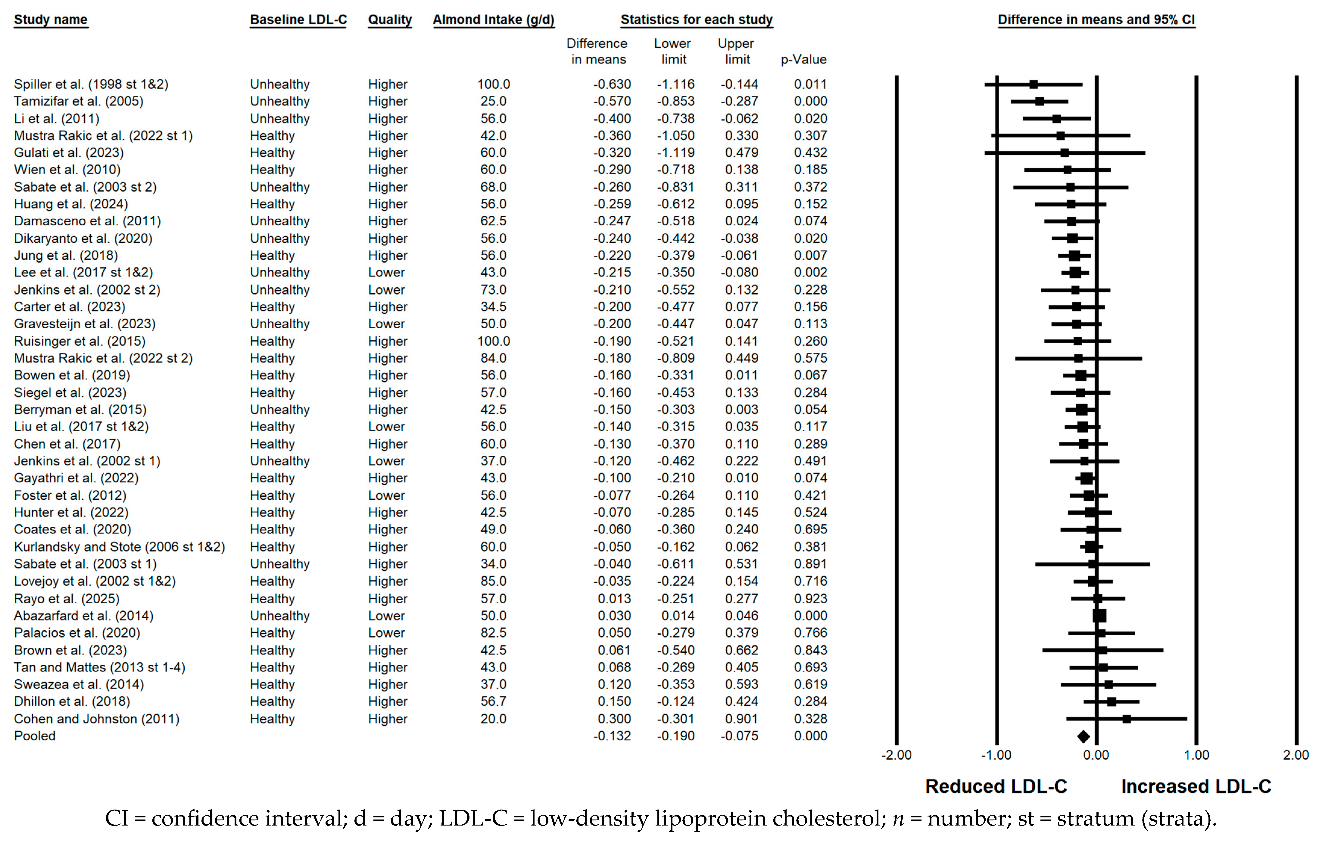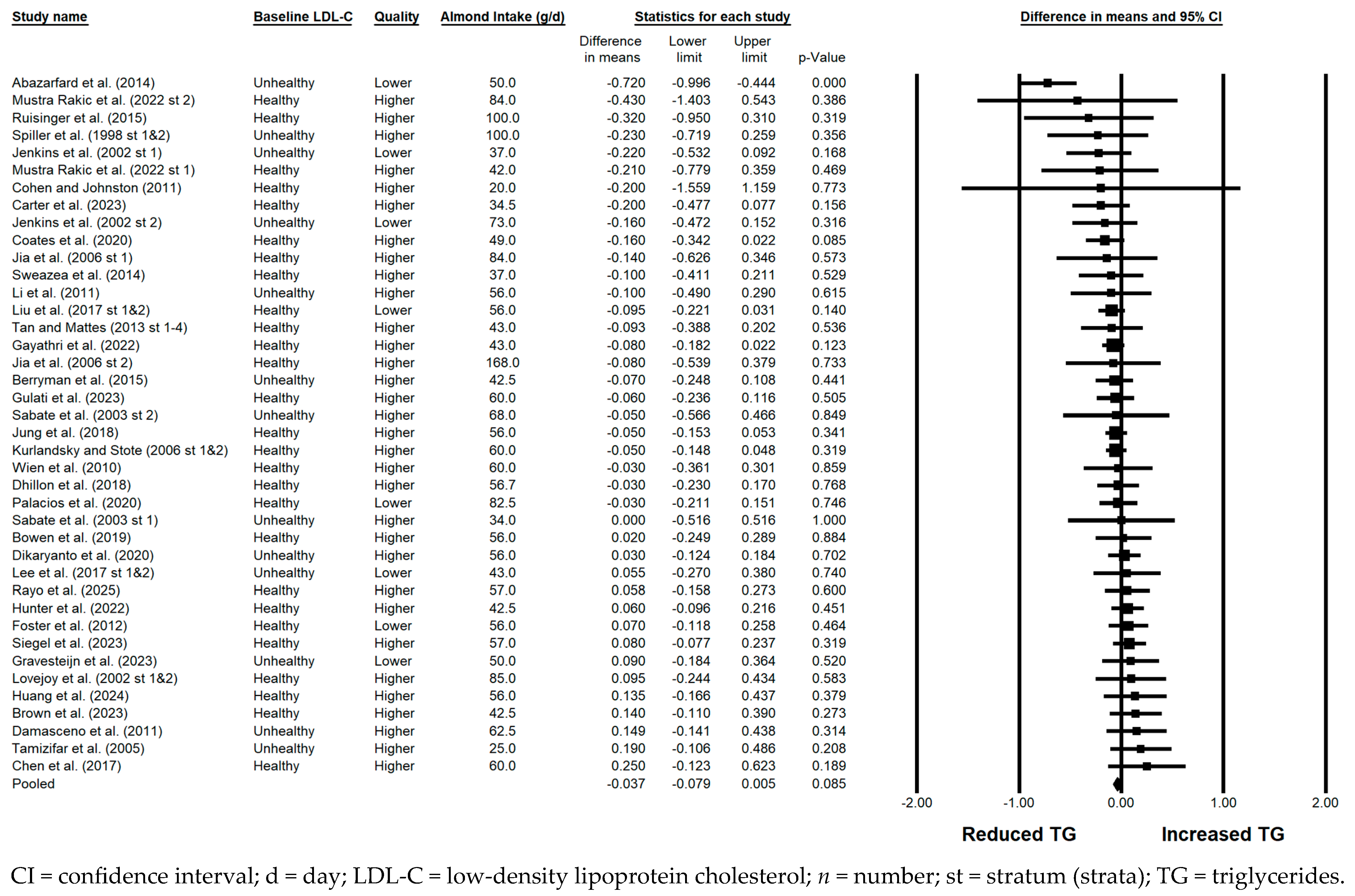 Musa-Veloso, K.; Gauntlett, C.; Geronimo, K.; Vicente, I.; Ho, S.P.L. Blood Lipid Levels in Response to Almond Consumption: A Systematic Review and Meta-Analysis of Randomized Controlled Trials. Nutrients 2025, 17, 2791. https://doi.org/10.3390/nu17172791