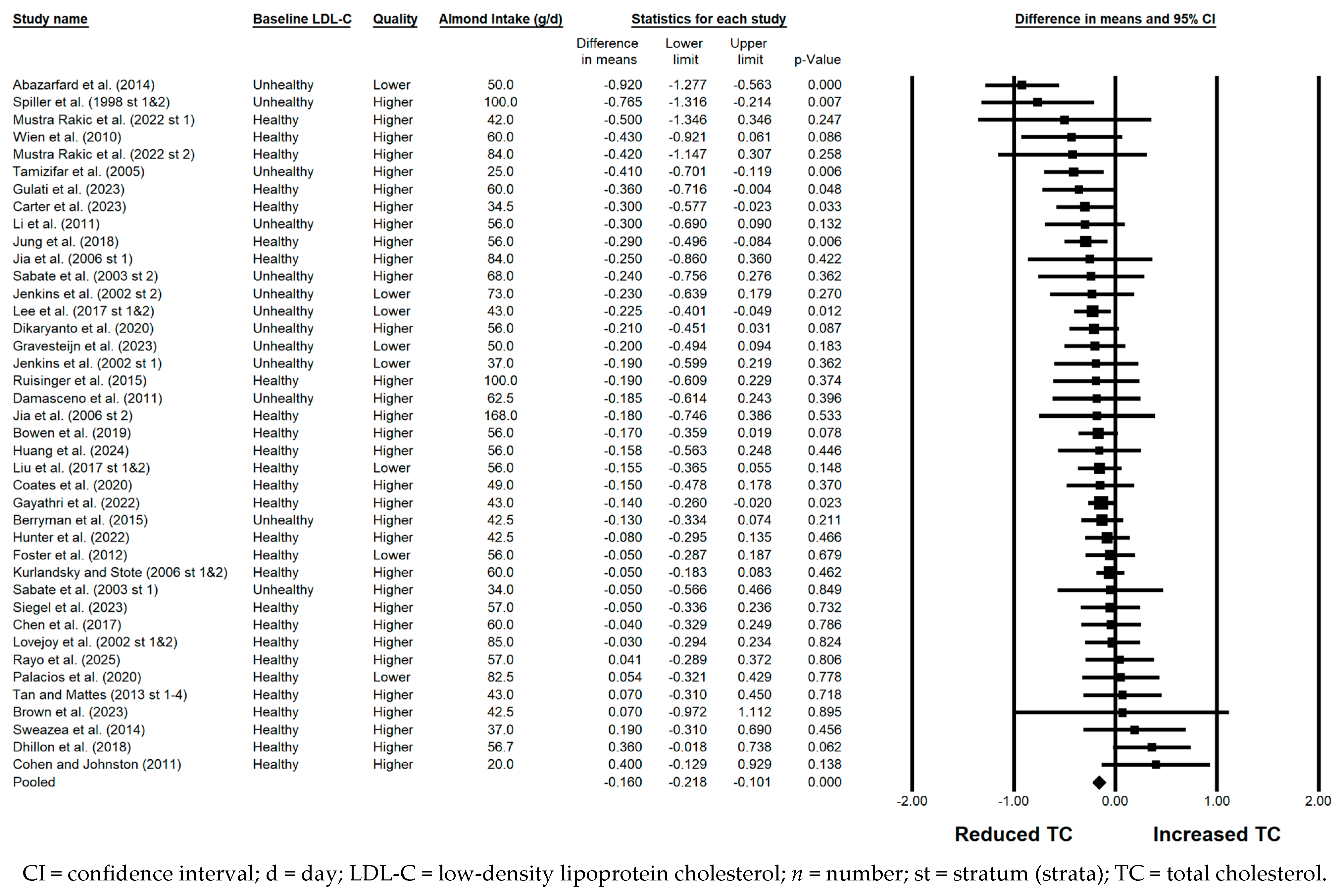 APA StyleMusa-Veloso, K., Gauntlett, C., Geronimo, K., Vicente, I., & Ho, S. P. L. (2025). Blood Lipid Levels in Response to Almond Consumption: A Systematic Review and Meta-Analysis of Randomized Controlled Trials. Nutrients, 17(17), 2791. https://doi.org/10.3390/nu17172791