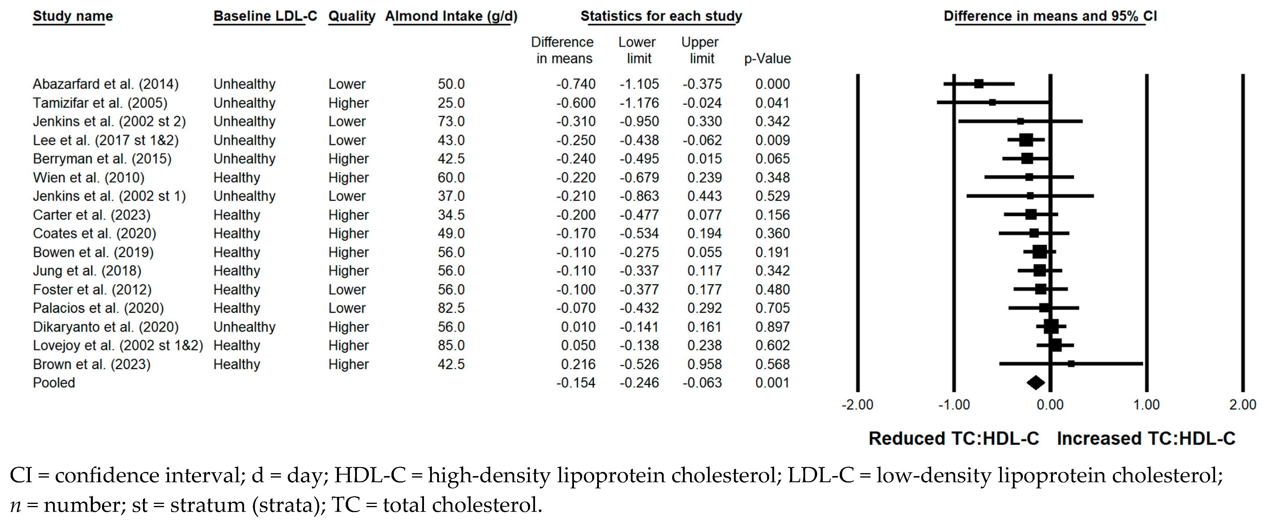 | TC:HDL-C (n = 15 studies, 18 strata, 1050 subjects) | −0.154 (−0.246, −0.063) | 0.001 | 38.129 | 0.061 | 5 (R) | −0.07 (−0.18, 0.03) |