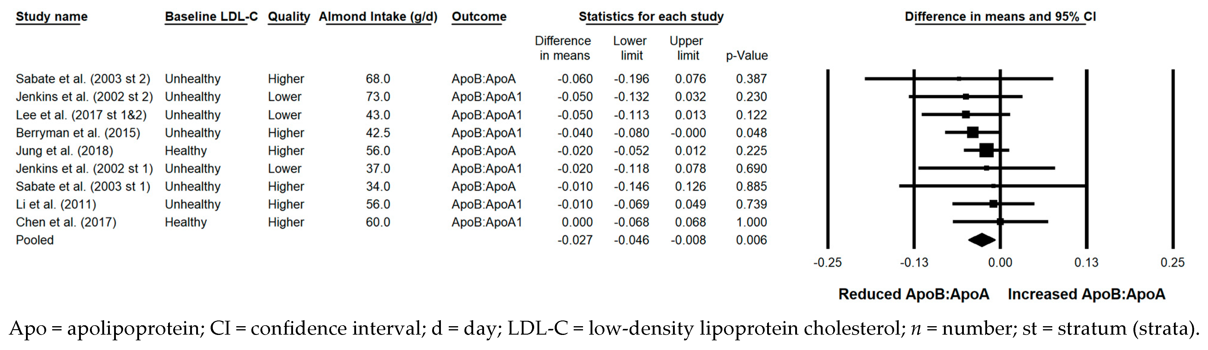 | ApoB:ApoA d (n = 7 studies, 10 strata, 268 subjects) | −0.027 (−0.046, −0.008) | 0.006 | 0.000 | 0.955 | 1 (R) | −0.03 (−0.05, −0.01) |
