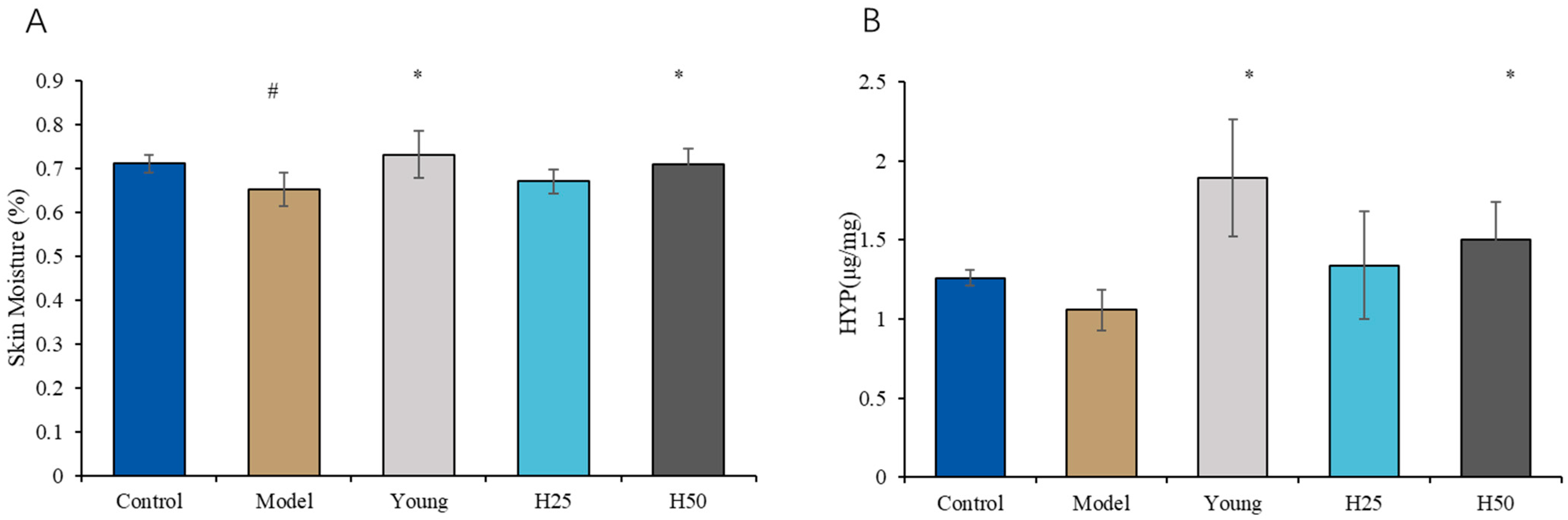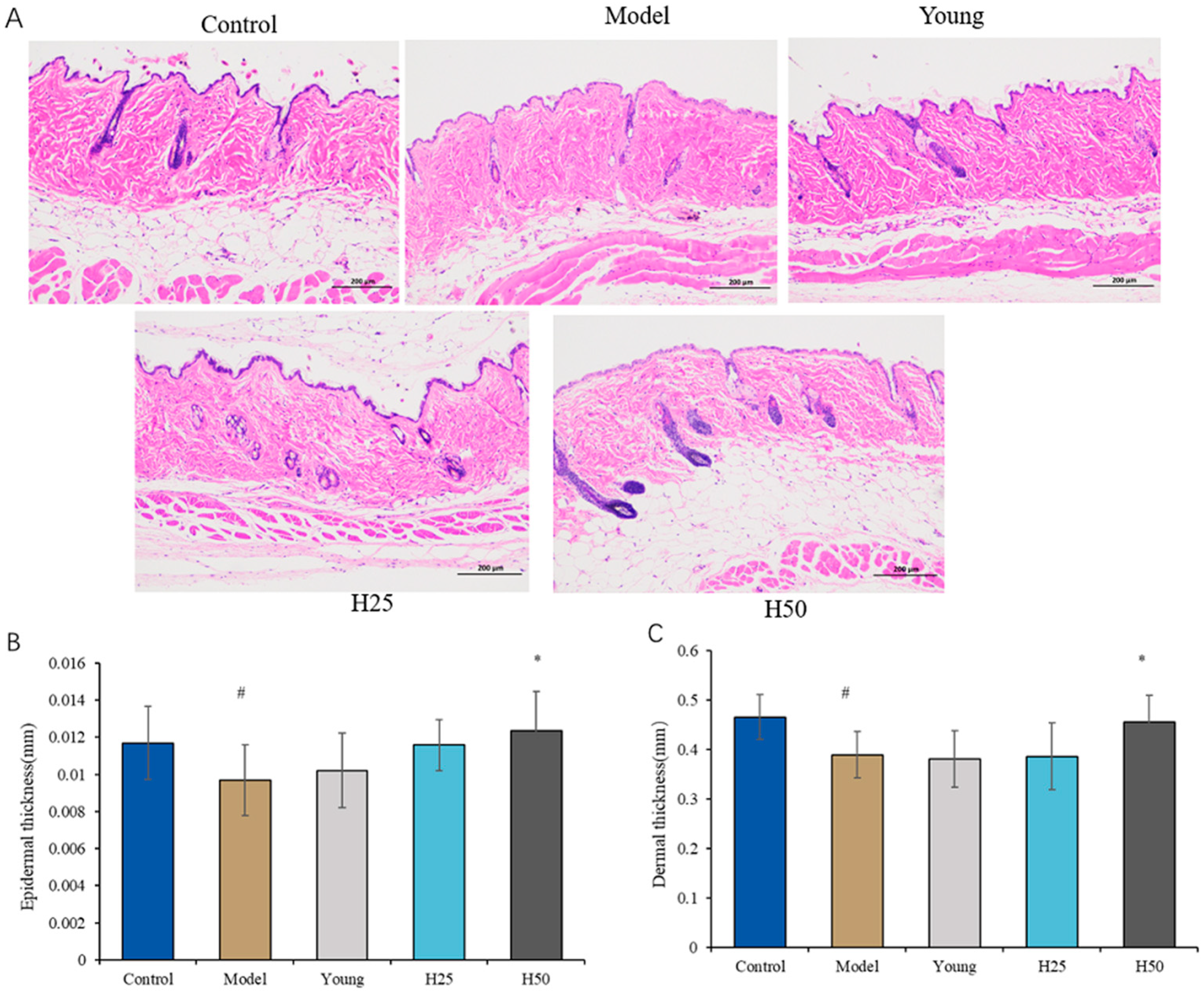 2.7. Measurement of Skin Hydroxyproline (HYP) Levels
